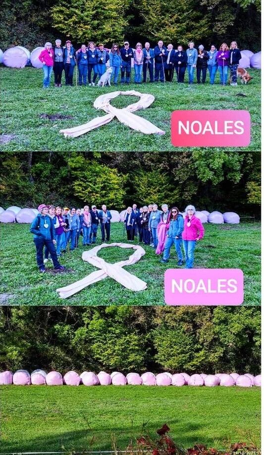 También los vecinos de Noales, en el municipio de Montanuy, conmemoraron el sábado el Día Mundial de la Lucha contra el Cáncer de Mama. Si en 2020 lo hicieron decorando los balcones de las casas con lazos rosas, en 2021, además de lucir lazos y corazones rosas, caminaron hasta un campo en el que el plástico de los ‘bolos’ de hierbas era rosa.