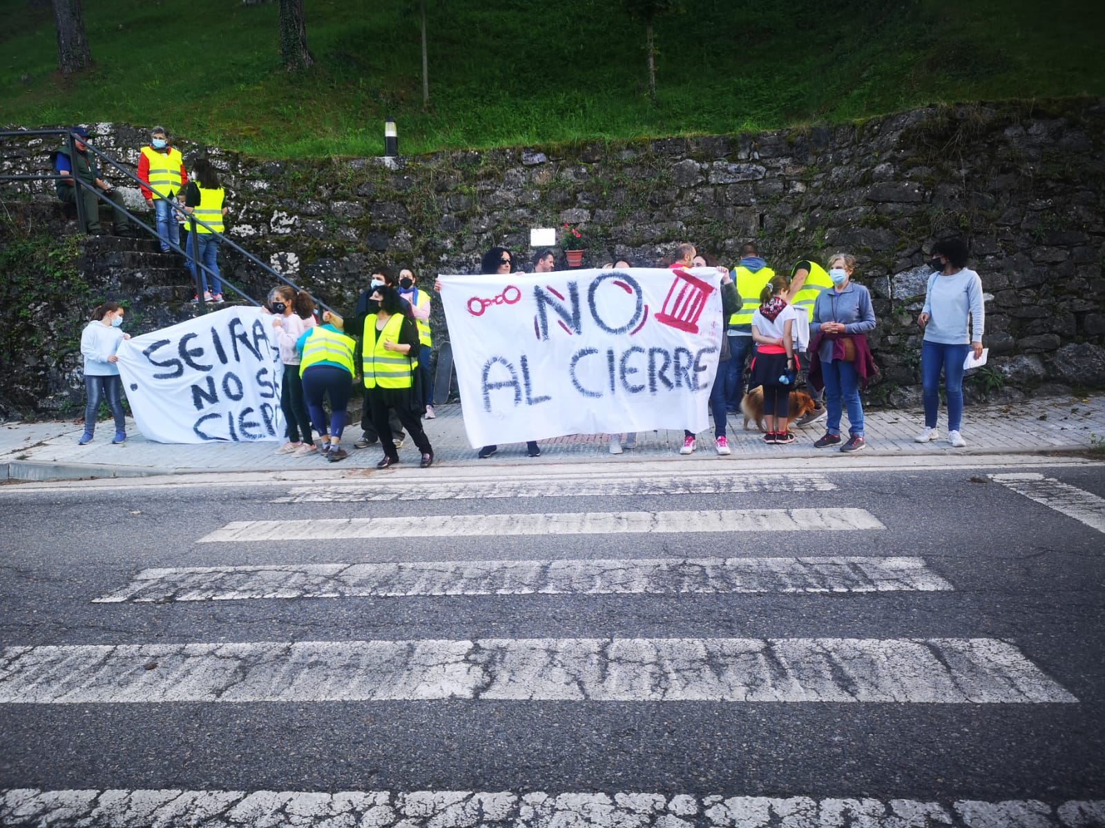 Un numeroso grupo de vecinos han aprovechado el paso de cebra de la N-260 para cruzarlo (puesto que no tenían permiso para cortar la carretera) portando un par de pancartas en las que se podía leer ‘Seira no se cierra’ y ‘No al cierre’.