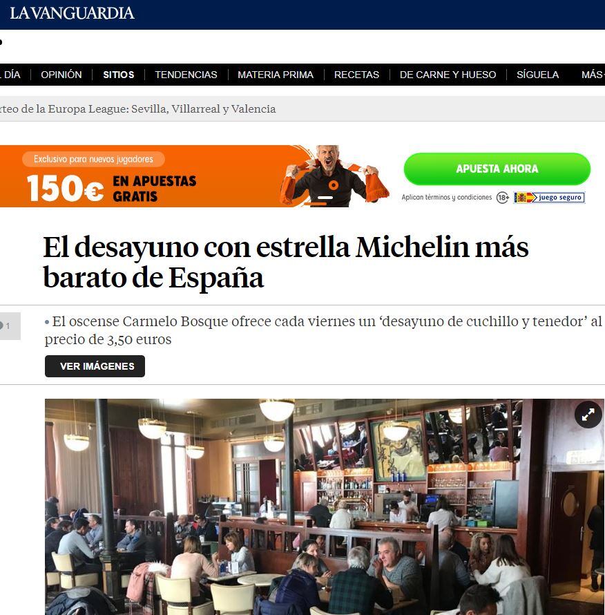 Hoy tocaban huevos fritos con jamón y patatas. Pero cada semana se varía, y otros viernes, el “desayuno de cuchillo y tenedor” del Café del Arte, puede ser huevos fritos con migas, bacalao con tomate, albóndigas con salsa de almendras o salmorrejo. Todo ello, con bebida y café por 3,50 euros. La página web de la Cadena Ser hace unos días, y este viernes el periódico La Vanguardia se hacen eco de la noticia curiosa de que un chef con estrella Michelin, Carmelo Bosque, propietario también del vecino Lillas Pastia, ofrezca desayunos tan económicos de los que disfrutan decenas de oscenses.