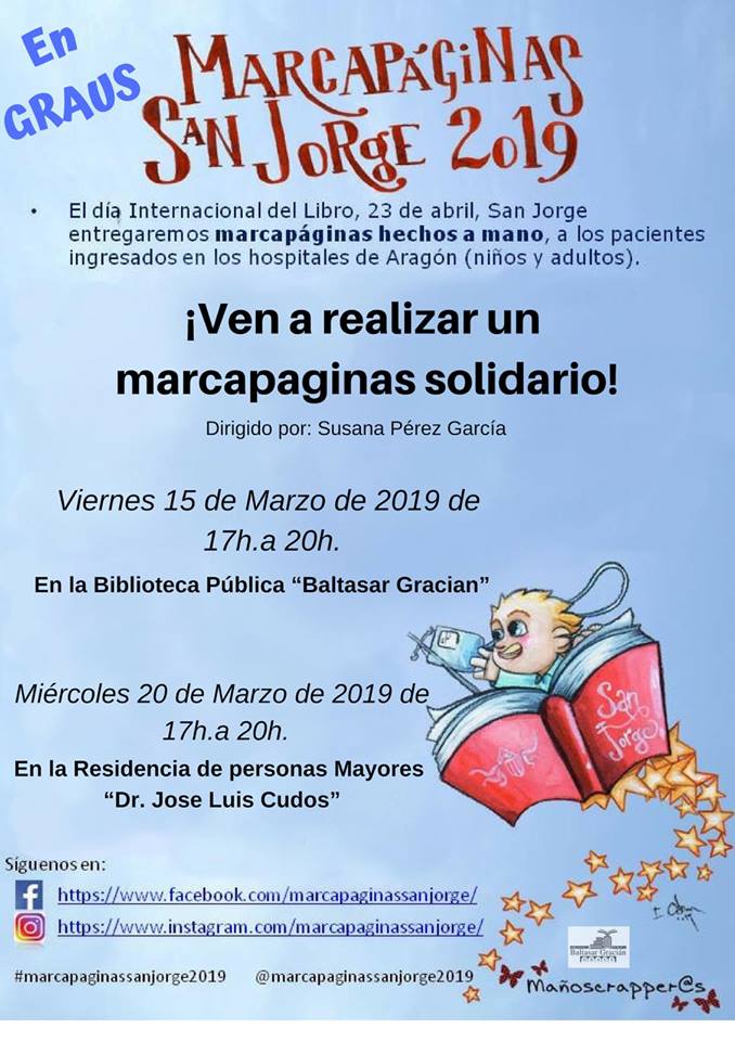 La biblioteca Baltasar Gracián de Graus se ha sumado este año al proyecto Marcapáginas San Jorge 2019 que, desde hace cuatro años, viene realizando el grupo Mañoscrapper@s y que consiste en repartir, el día de San Jorge, marcapáginas entre los pacientes de algunos hospitales de Aragón. Se realizarán dos sesiones, una el viernes 15, en la biblioteca y otra el miércoles 20, en la residencia de mayores, de 17 a 20 horas, para realizar marcapáginas solidarios.
