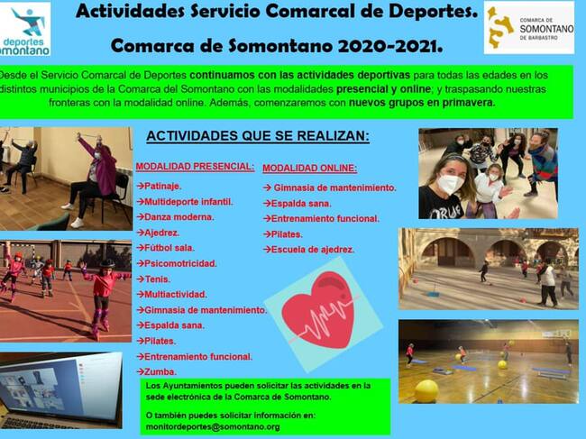 Los Ayuntamientos podrán solicitar a la Comarca de Somontano, la realización de nuevas actividades presenciales a través de la sede electrónica, con la previsión de abrir nuevos grupos en primavera. También se pueden realizar todos los trámites de inscripción de nuevos participantes a través de la sede electrónica. En el Servicio Comarcal de Deportes se informará de la disponibilidad actual de días y horarios para impartirlas. Las actividades disponibles del catálogo de este curso, vigentes para este segundo trimestre son:
