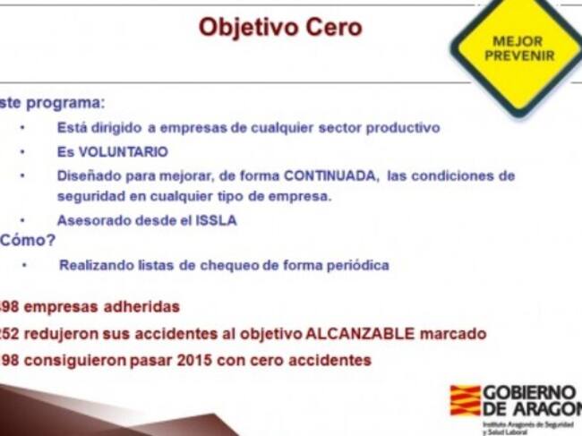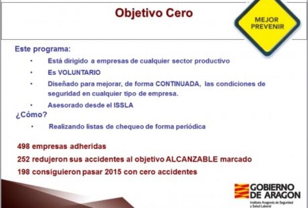 El Departamento de Economía, Industria y Empleo, a través de la Dirección General de Trabajo y el Instituto Aragonés de Seguridad y Salud Laboral (ISSLA), continúa trabajando para incrementar la seguridad laboral en todos los sectores mediante el Programa “Objetivo Cero Accidentes”. El objetivo es reducir los accidentes laborales hasta conseguir la meta que da nombre a la iniciativa. En la actualidad hay 498 empresas aragonesas adheridas.