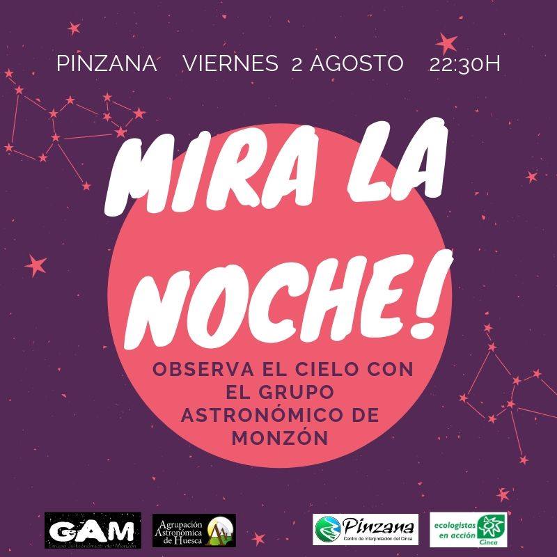 El Centro de Interpretación del Río Cinca “Pinzana”, gestionado desde Ecologistas en Acción, ha organizado para el día 2 de agosto, en colaboración con el Grupo Astronómico de Monzón la actividad “Mira al cielo”, a partir de las 22.30h.