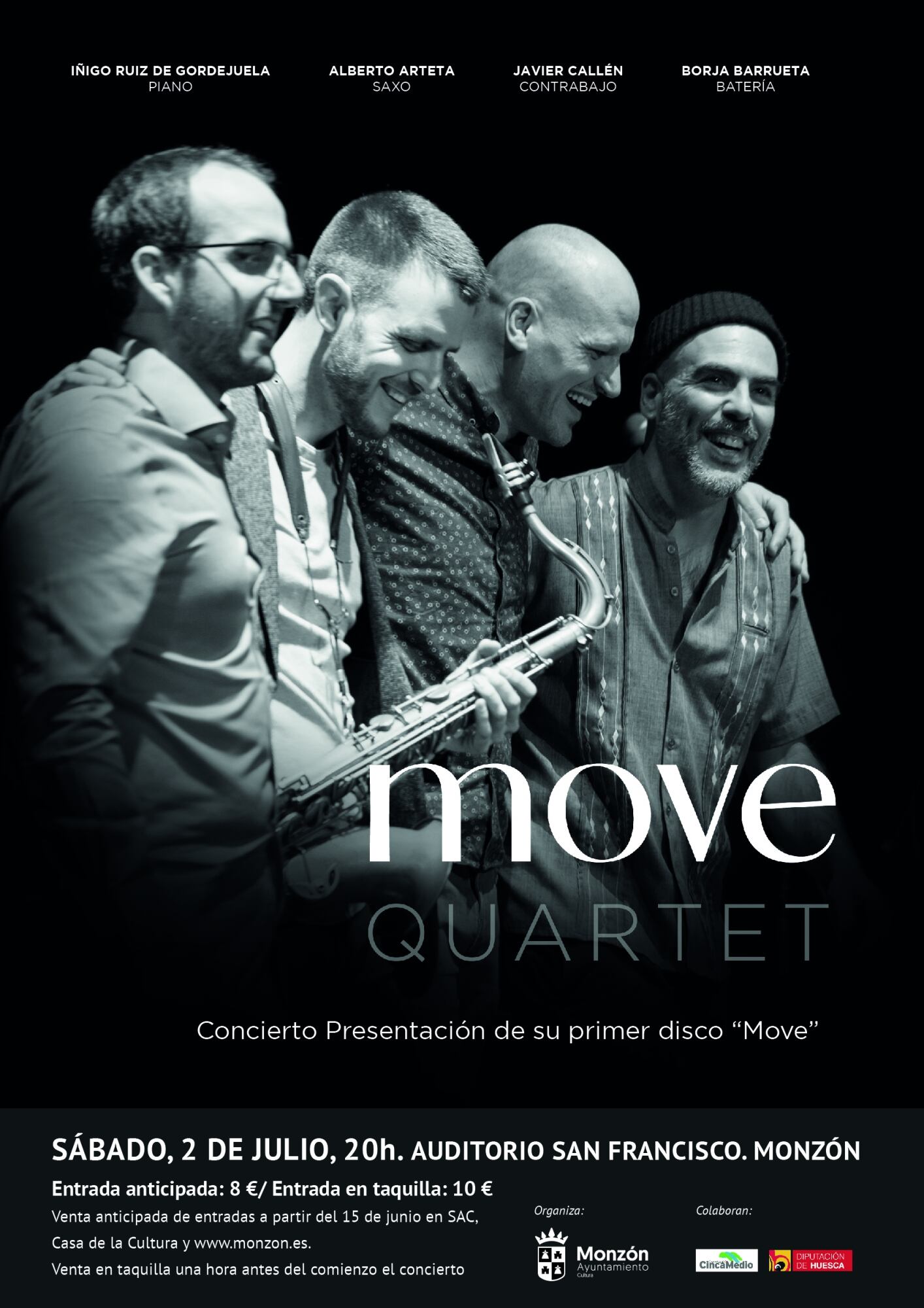 La concejalía de Cultura del Ayuntamiento de Monzón ha programado para el sábado, día 2 de julio, a las 20:00h en el Auditorio San Francisco la presentación del primer disco de Move quartet, que lidera el montisonense Javier Callén. Las entradas salen a la venta este miércoles, día 15 de junio en anticipada, al precio de 8 euros, en el SAC, Casa de la Cultura y www.monzon.es.