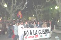 Una multitudinaria concentración en contra de la guerra a Irak que salía del Paseo del Coso, con la intención de acabar ante la sede de UGT donde estaba previsto leer el manifiesto conjuntamente entre la secretaria comarcal de CCOO, Charo Bruned y el secretario comarcal de UGT, Miguel Ángel Colomina. Actuación que no ha podido llevarse a cabo a causa de la lluvia, que ha llevado a los organizadores a decidir detenerse ante la sede de Partido Popular para leerlo.