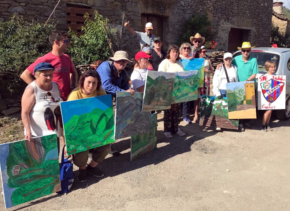 Con su hijo y concejal de este municipio, su esposa y varios familiares, han estado Miguel Gracia y Guillermo Palacín, acompañados también de la vicepresidenta de la Diputación, Elisa Sancho, y de Marisa Torres y Gonzalo Alfaro, presidenta y secretario del grupo plástico oscense La Pataquera, que están tras esta iniciativa que ha conseguido llenar la localidad con cerca de 70 personas y un año más crear un itinerario artístico por aquellos lugares elegidos por los pintores instalados en diferentes puntos que contribuyen con sus obras a hacer más visible este pequeño pueblo.