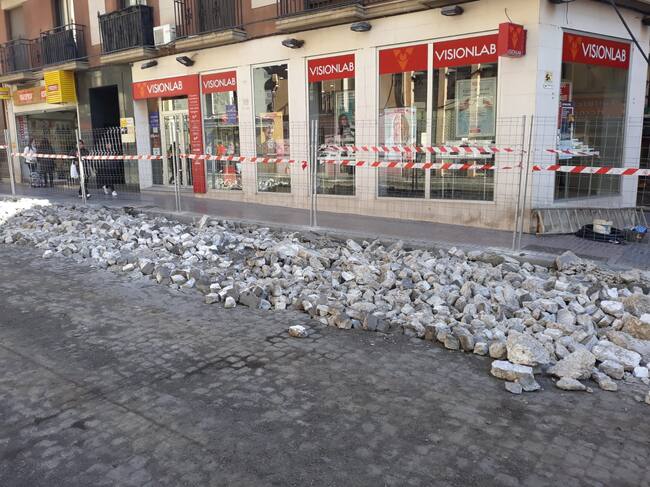Tras cuatro días de intenso trabajo el Coso Bajo de Huesca ha cambiado por completo su imagen. El tramo entre el cruce de la calle Goya y la calle Heredia (la esquina con la oficina de Ibercaja) tiene levantado una sección de asfalto que ha dejado al descubierto el adoquinado que durante años fue la plataforma de los Cosos y buena parte del centro. De esto hace muchos años pero vuelve a salir a la luz con estas obras que tienen una duración prevista de 9 meses.
