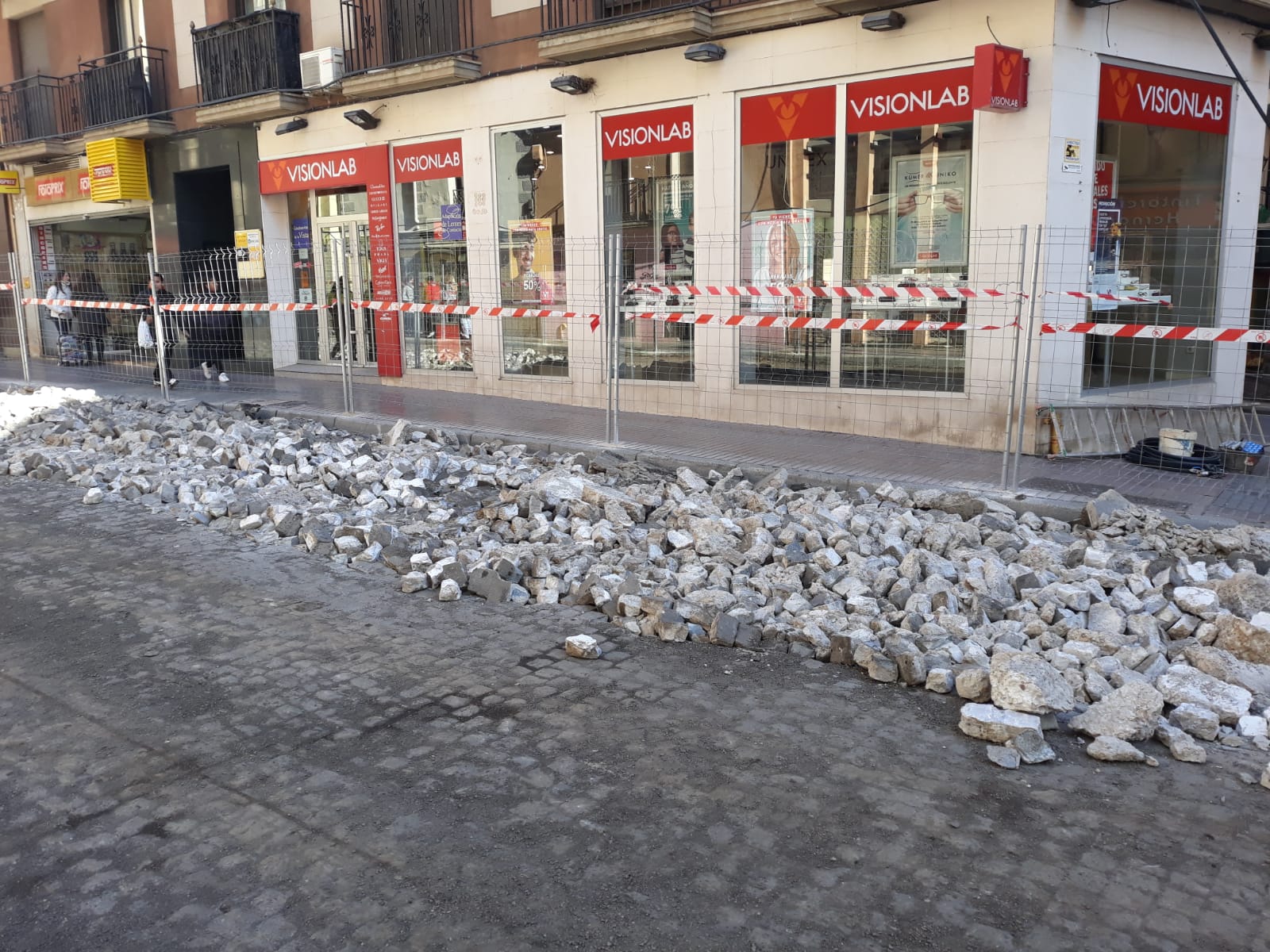 Estos días los peatones lo tienen más difícil para andar por el Coso Bajo. Las dos estrechas aceras son la única vía de paso, y la calzada interior se está levantando. Los trabajos, adjudicados a la UTE Domec-Acyc Obras y Servicios S.L.U por 1'8 millones de euros, continuarán abriendo las zanjas necesarias para acometer la renovación de las redes de saneamiento del subsuelo.