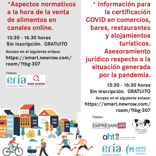 La segunda sesión formativa, Asesoramiento jurídico respecto a la situación generada por la pandemia, se impartirá al día siguiente y en el mismo horario. En ella se analizará la información relativa a la certificación covid-19 en comercios, bares, restaurantes y alojamientos turísticos que otorga el sello Stopcoronavirus, que forma parte de la campaña de comercio seguro que el Ayuntamiento lleva a cabo con la Asociación de Comercio de Monzón y Cinca Medio y la Asociación de Hostelería y Turismo de Monzón y Cinca Medio. En esta acción también colaboran la Asociación de Mujeres Empresarias de la Provincia de Huesca (AMEPHU) y ERIA Consultores.