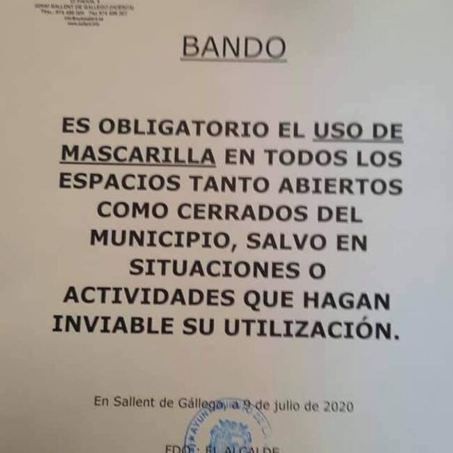 El Ayuntamiento de Sallent de Gállego ha emitido un bando donde informa del “uso obligatorio en todos los espacios, tanto abiertos como cerrados, del municipio salvo en situaciones o en actividades que se haga inviable su utilización”. El alcalde de la localidad, Jesús Gericó, señalaba que lo único que se ha hecho es aplicar el sentido común ya que muchas de las calles del municipio no tienen la distancia mínima y por ese motivo se ha decidido optar por esta decisión y más ahora cuando los fines de semana sus calles se llenan de turistas o de vecinos con segundas residencias.