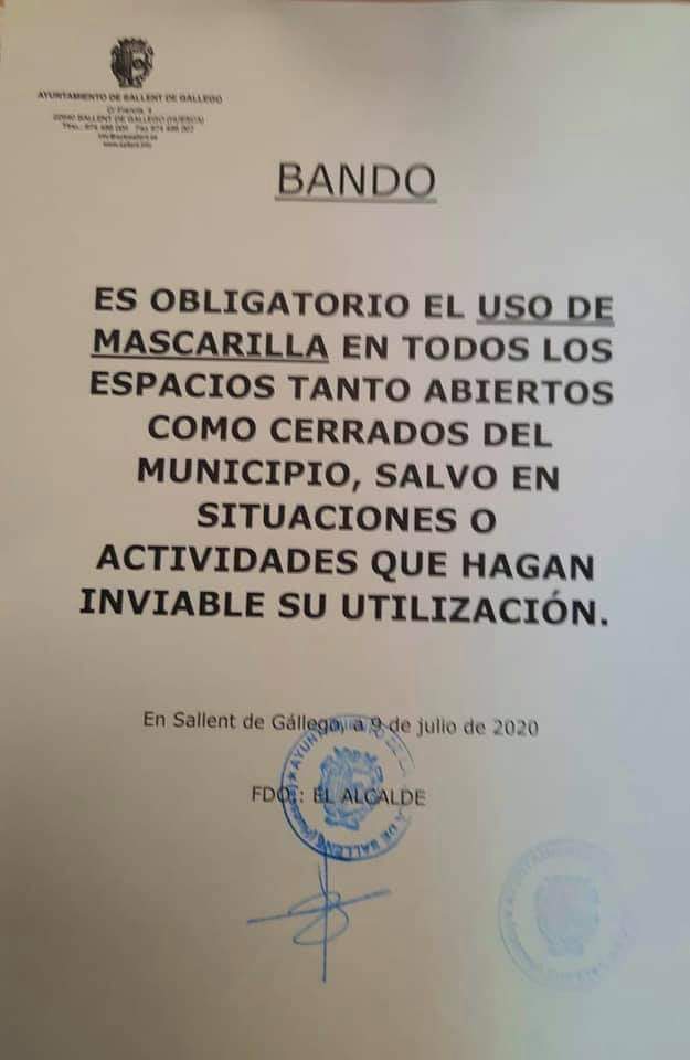 El Ayuntamiento de Sallent de Gállego ha emitido un bando donde informa del “uso obligatorio en todos los espacios, tanto abiertos como cerrados, del municipio salvo en situaciones o en actividades que se haga inviable su utilización”. El alcalde de la localidad, Jesús Gericó, señalaba que lo único que se ha hecho es aplicar el sentido común ya que muchas de las calles del municipio no tienen la distancia mínima y por ese motivo se ha decidido optar por esta decisión y más ahora cuando los fines de semana sus calles se llenan de turistas o de vecinos con segundas residencias.