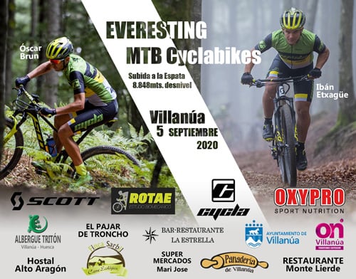 El 5 de septiembre llega a Villanúa un acontecimiento espectacular, el Everesting Cyclabikes 2020. Un reto en el que los riders del Cycla Bikes de Pamplona, Óscar Brun e Ibán Etxagüe, van a intentar conquistar el Everest con su MTB y en Villanúa. Es decir, van a intentar completar la altitud que tiene el monte Everest, 8848 m., recorriendo todas las veces que sea necesario la distancia existente entre la localidad y el Refugio de La Espata.