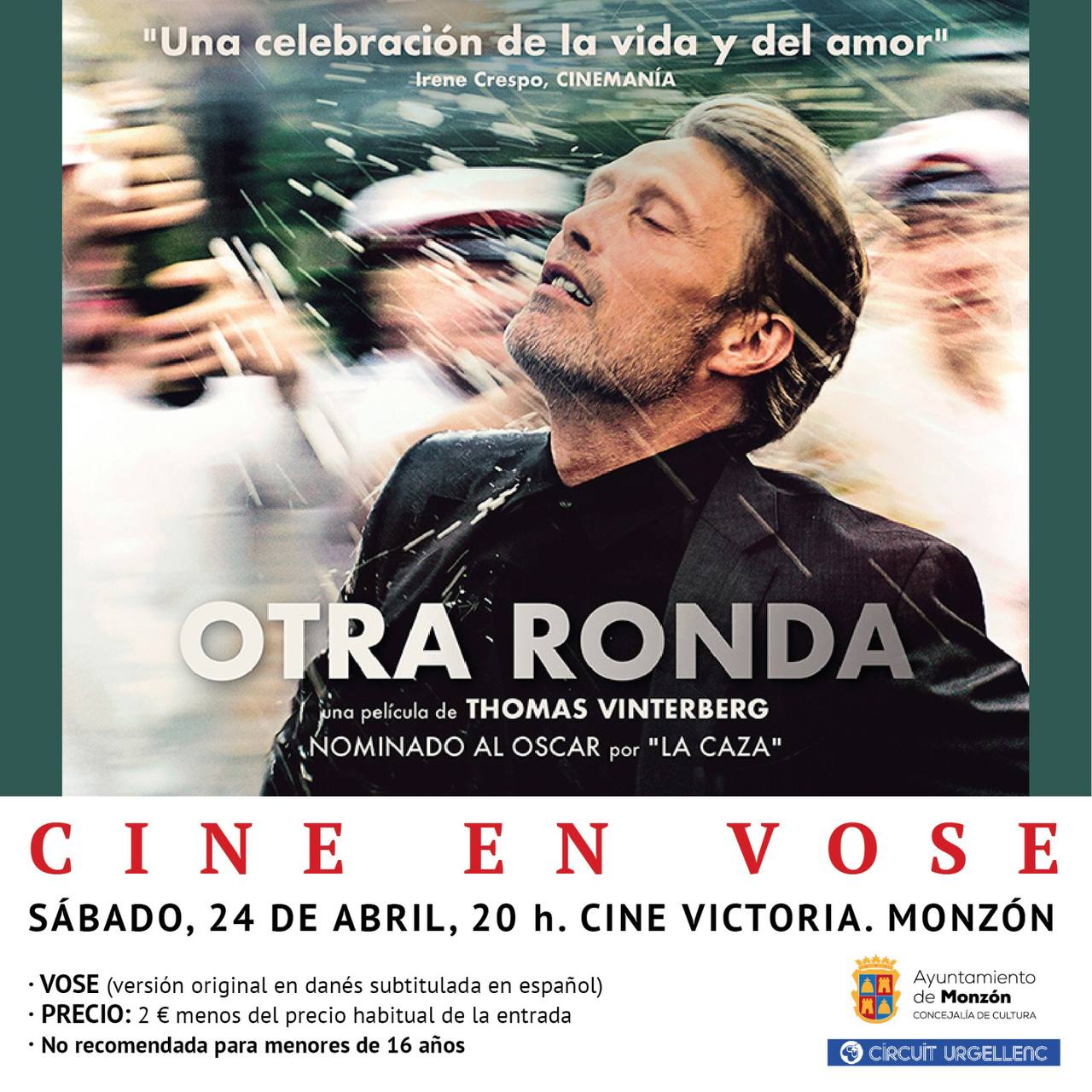 La Concejalía de Educación y Cultura del Ayuntamiento de Monzón propone una nueva película en versión original subtitulada en español. En esta ocasión, se trata de la premiada "Otra ronda" (Drunk), que se proyectará en el Cine Victoria, a las 20h., en danés con subtítulos en español. Esta proyección se suma a las muchas propuestas culturales que ofrecen desde la concejalía para el puente de San Jorge.