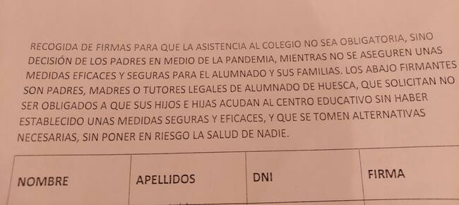 En las circunstancias actuales causadas por la covid-19 y con el inicio del curso a la vuelta de la esquina, un colectivo de padres y madres de Huesca ha empezado a recoger firmas para que llevar a sus hijos al colegio no sea obligatoria.