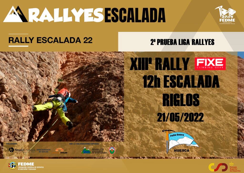 Este sábado 21 de mayo, el club Peña Guara de Huesca, con la colaboración de la Comarca de la Hoya de Huesca, el Ayuntamiento de Riglos, el Refugio de Riglos, Federación Aragonesa de Montañismo y de la FEDME, organiza una nueva edición del Rally de Escalada de Riglos; el XIII Rally FIXE 12 horas Escalada de Riglos.