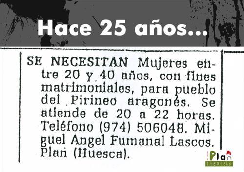 A un grupo de amigos viendo la película ‘Caravana de mujeres’ se le ocurre la idea de publicar un anuncio en el Heraldo de Aragón con las palabras “Se necesitan mujeres de entre 20 y 40 años con fines matrimoniales para pueblo del Pirineo aragonés”. Pronto comenzaron a llegar mujeres desde distintos puntos de España y prensa para cubrir el acontecimiento desde todos los rincones del planeta. Se calcula que de esta iniciativa que se prolongó durante cinco años, se conformaron unas 40 parejas controladas.
