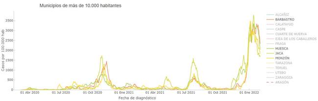 A siete días, en la actualidad la incidencia en la provincia es de 1.770 casos por cada 100.000 habitantes, y el máximo fue el 14 de enero con 2.920. En Jaca, el máximo fue el 14 de enero con 3.793 casos, y ese mismo día también se registró en Huesca con 3.347. En Monzón se alcanzó el máximo el 4 de enero con 3.486, y en Barbastro, el 5 con 3.406.