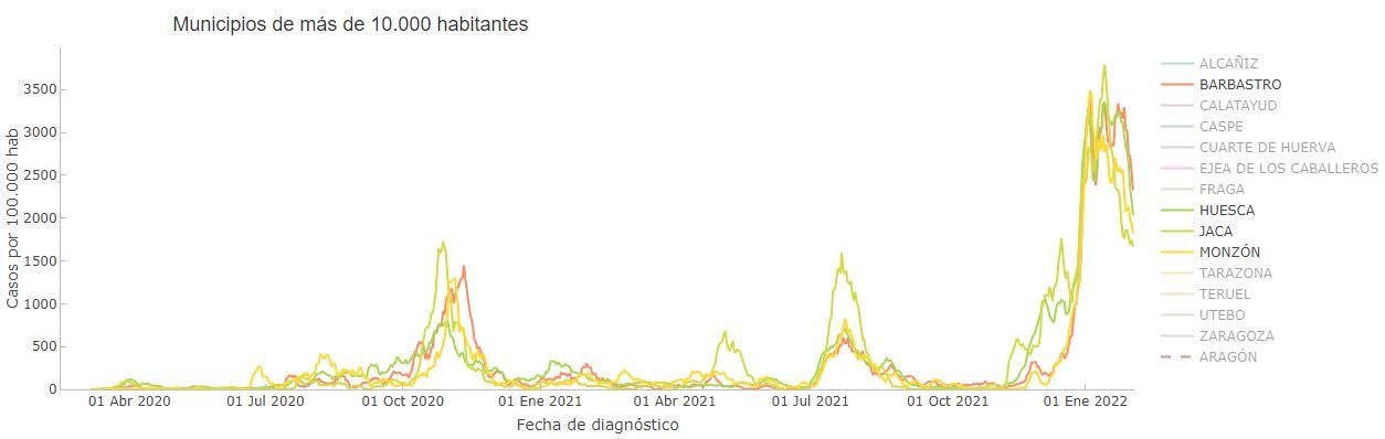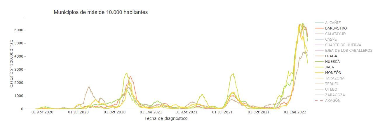 A siete días, en la actualidad la incidencia en la provincia es de 1.770 casos por cada 100.000 habitantes, y el máximo fue el 14 de enero con 2.920. En Jaca, el máximo fue el 14 de enero con 3.793 casos, y ese mismo día también se registró en Huesca con 3.347. En Monzón se alcanzó el máximo el 4 de enero con 3.486, y en Barbastro, el 5 con 3.406.