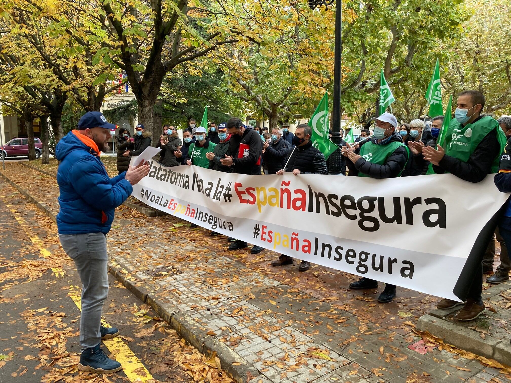 La plataforma "No a la España insegura" se manifestaba en la plaza Cervantes de la capital oscense, frente a la Subdelegación del Gobierno contra la reforma de la Ley de Seguridad Ciudadana con la participación de un centenar de personas de sindicatos de Policía Nacional, Local y Autonómica, asociaciones de Guardia Civil o partidos políticos, "ante la imposición del Gobierno y de sus socios de una modificación de la Ley de Seguridad Ciudadana, sin dialogo y arbitraria", según los convocantes.