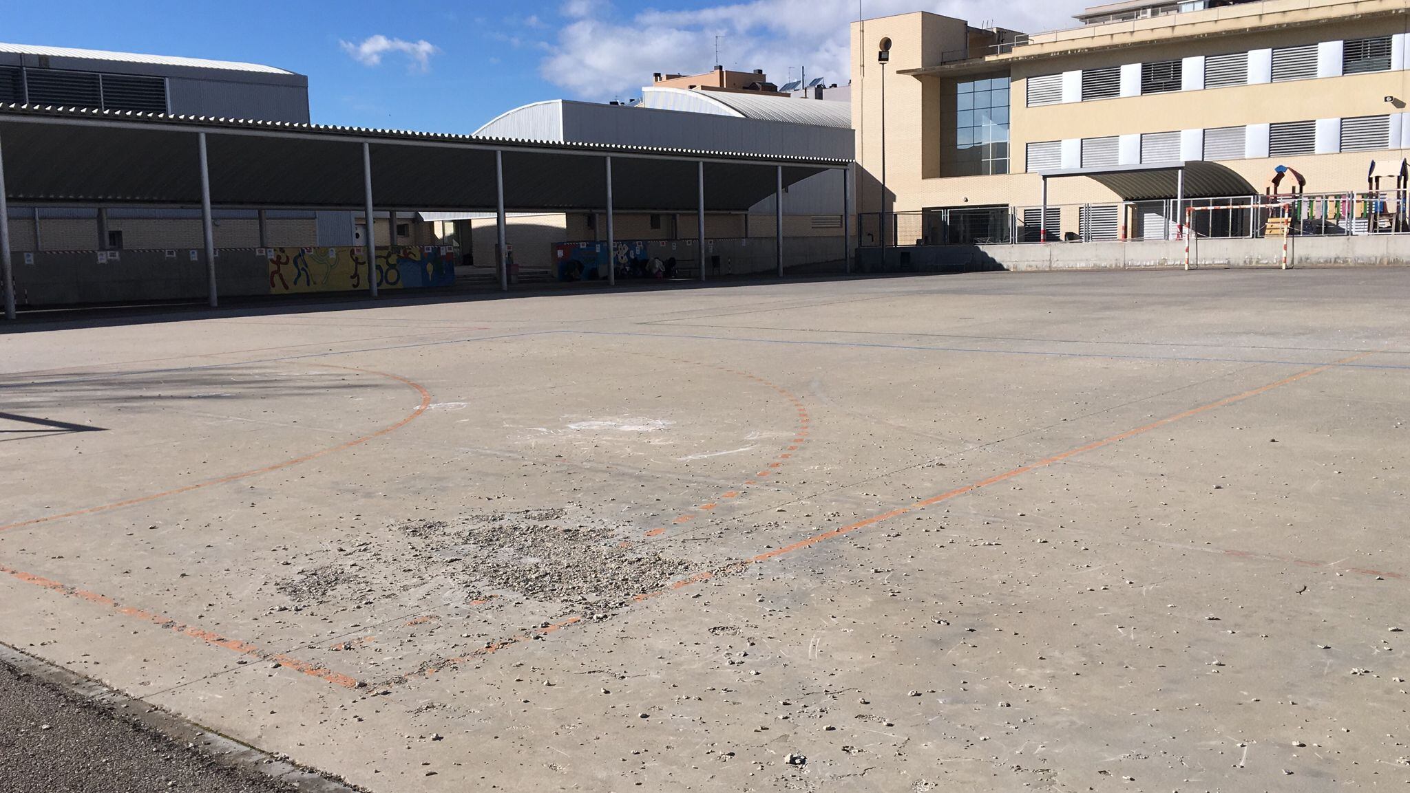 Profesores y padres de alumnos del colegio Pirineos-Pyrénées de Huesca habían mostrado sus quejas por la situación en la que se encontraban algunass zonas del patoio de recreo del centro. La gran nevada de hace tres semanas, las heladas de este invierno y la sal que ha habido que echar ha provocado que se hayan levantado grandes desconchones y se hayan quedado sueltas piedras, guijarros y fragmentos de cemento de la solera.
