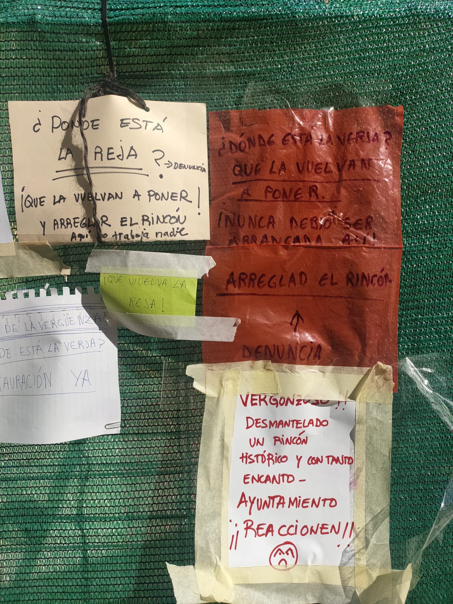 "¡Que vuelva la reja!", "desmantelado un rincón histórico y con encanto" o "Ayuntamiento, reaccionen", son algunas de las frases que han aparecido colgadas en el vallado del edificio de la plaza San Pedro número 1 tras haberse retirado la reja del jardín de esta casa, de titularidad privada. El inmueble lleva más de dos años vallado, a la espera de empezar a acometer la rehabilitación de la vivienda.