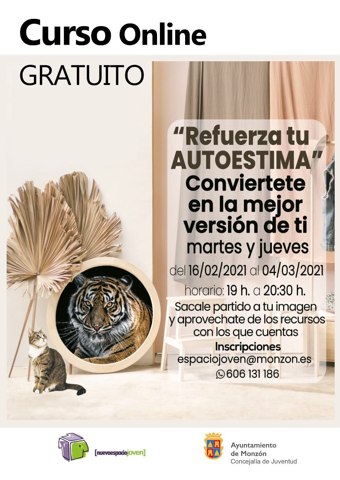 Bajo el título “Refuerza tu autoestima, conviértete en la mejor versión de ti”, el Espacio Joven de Monzón organiza un curso online gratuito que tendrá lugar los martes y jueves, del 16 de febrero al 4 de marzo, en horario de 19h a 20.30h. Las inscripciones deben realizarse a través del correo espaciojoven@monzon.es o llamando al 606 131 186.