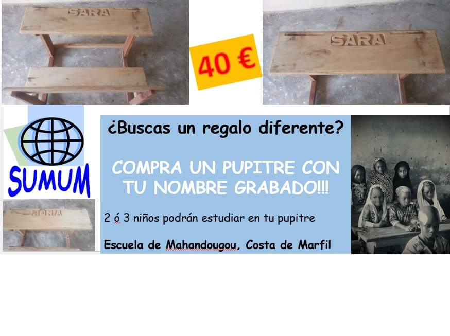 En una sociedad tan consumista en la que se tiene de todo, esta ONG lanza este regalo diferente. Consiste en comprar un pupitre con el nombre grabado, tanto el de quien regalo como de quien recibe. Para más información, enviar mensaje privado a través del Facebook de SUMUM o correo a ongsumum@gmail.com