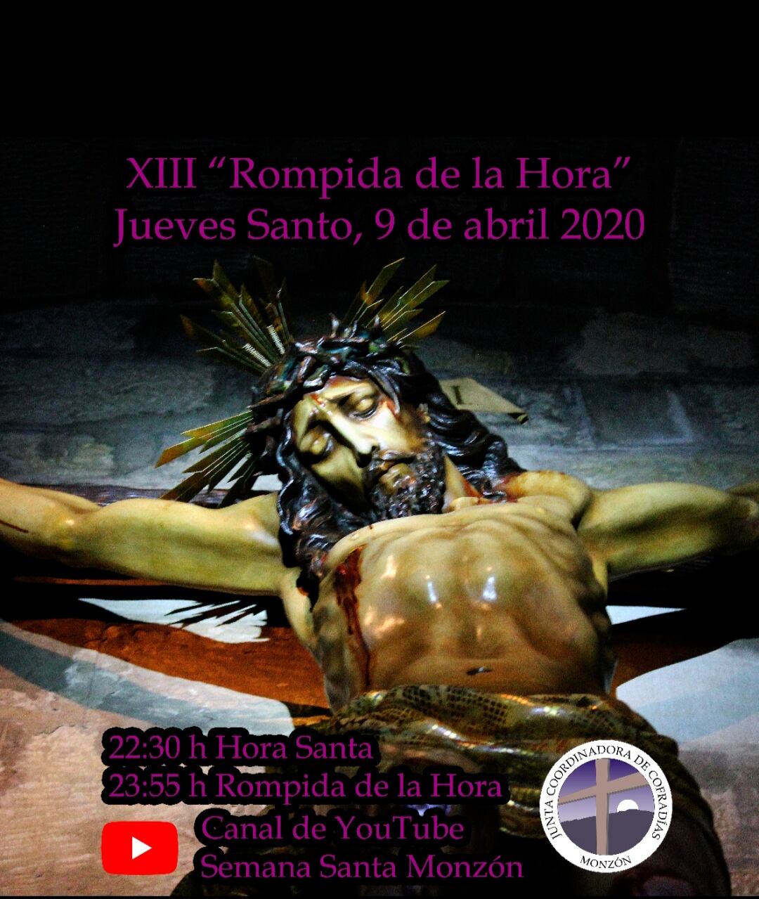 La Junta Coordinadora de las Cofradías de la Semana Santa en Monzón, con el objetivo de no romper con la tradición de la Rompida de la Hora en la medianoche del Jueves Santo, propone a los cofrades y vecinos participar desde sus casas tocando sus instrumentos.