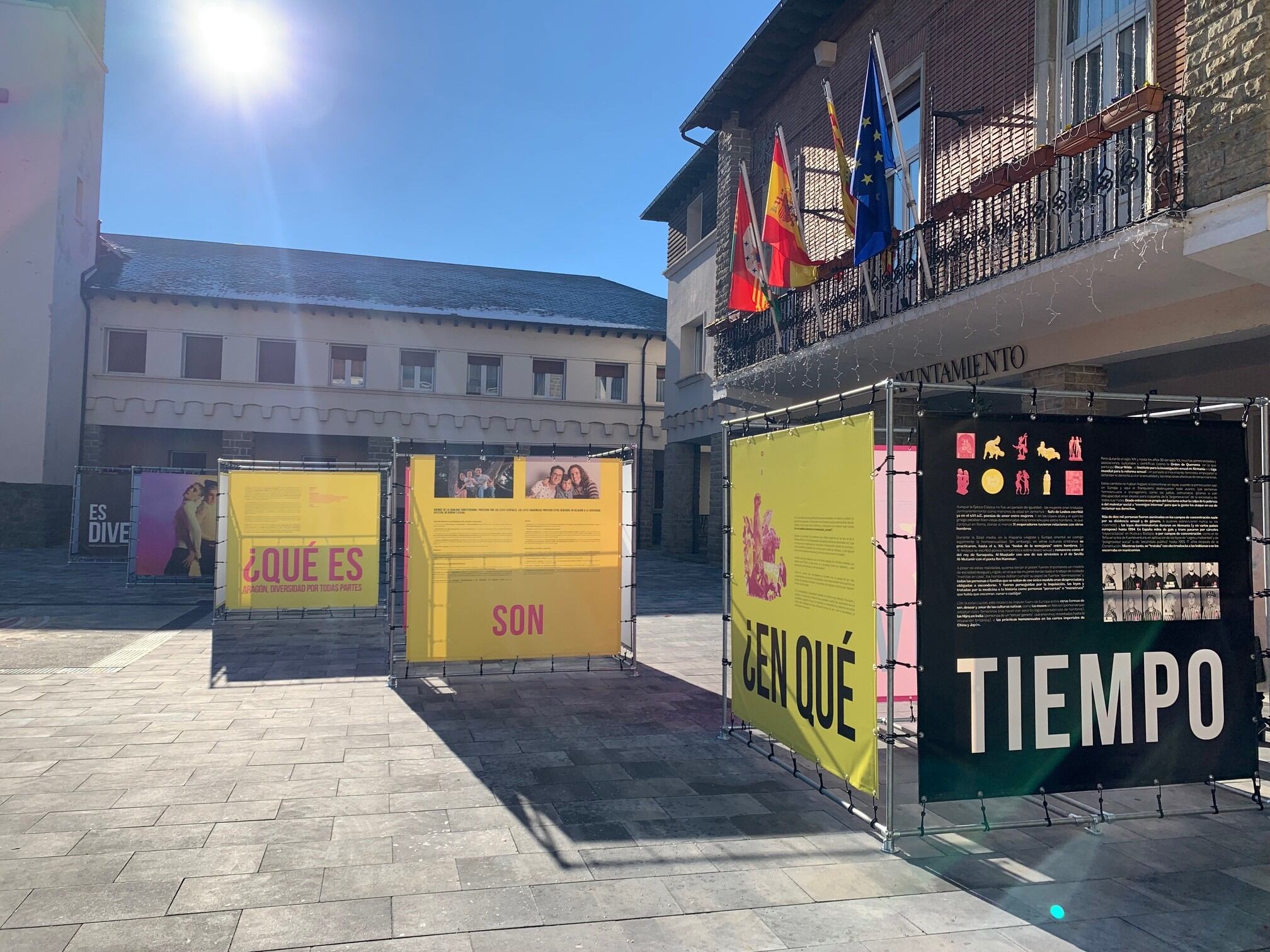 La plaza España de Sabiñánigo acoge una exposición sobre la historia, los derechos, los recursos y la visibilidad de la diversidad afectivo-sexual en Aragón. “Aragón, diversidad por todas partes” es el nombre de la iniciativa que, a través de cinco cubos de dos metros de altura, busca acercar esta realidad a los municipios aragoneses con el objetivo de promover el respeto y la no discriminación y mostrar, al mismo tiempo, el apoyo legal, institucional y social difundiendo herramientas que faciliten su cumplimiento.