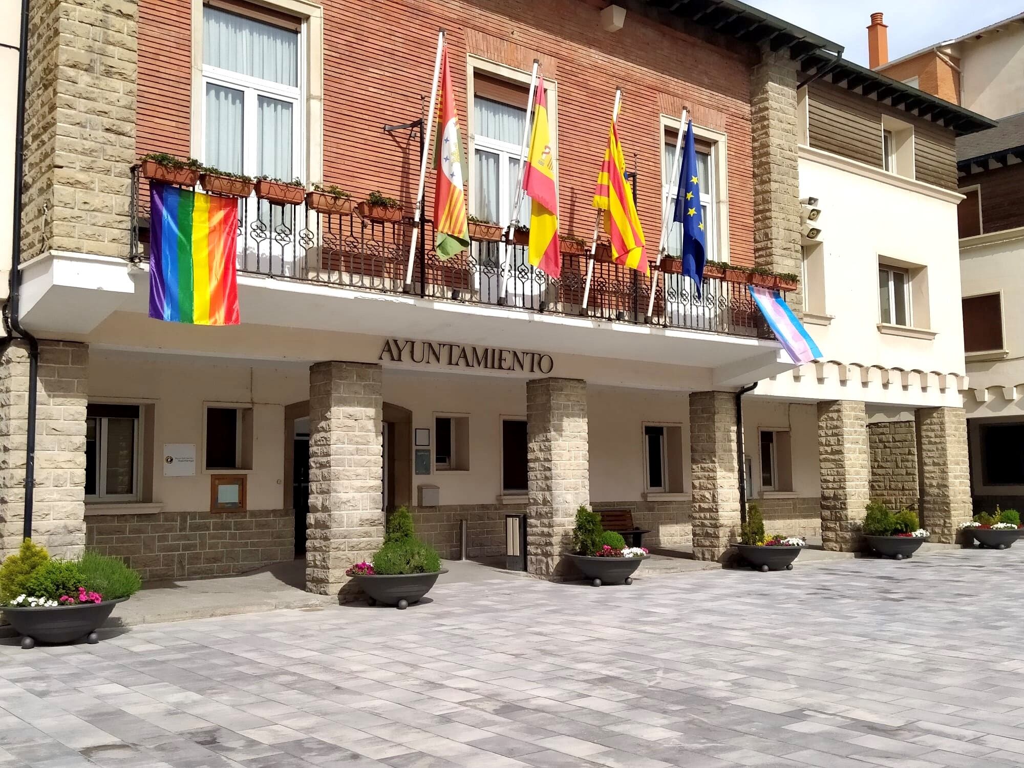 El balcón del ayuntamiento luce durante el día de hoy las banderas Trans y LGTBI apoyando así el derecho de cualquiera de ser y amar como quiera y a quien quiera.