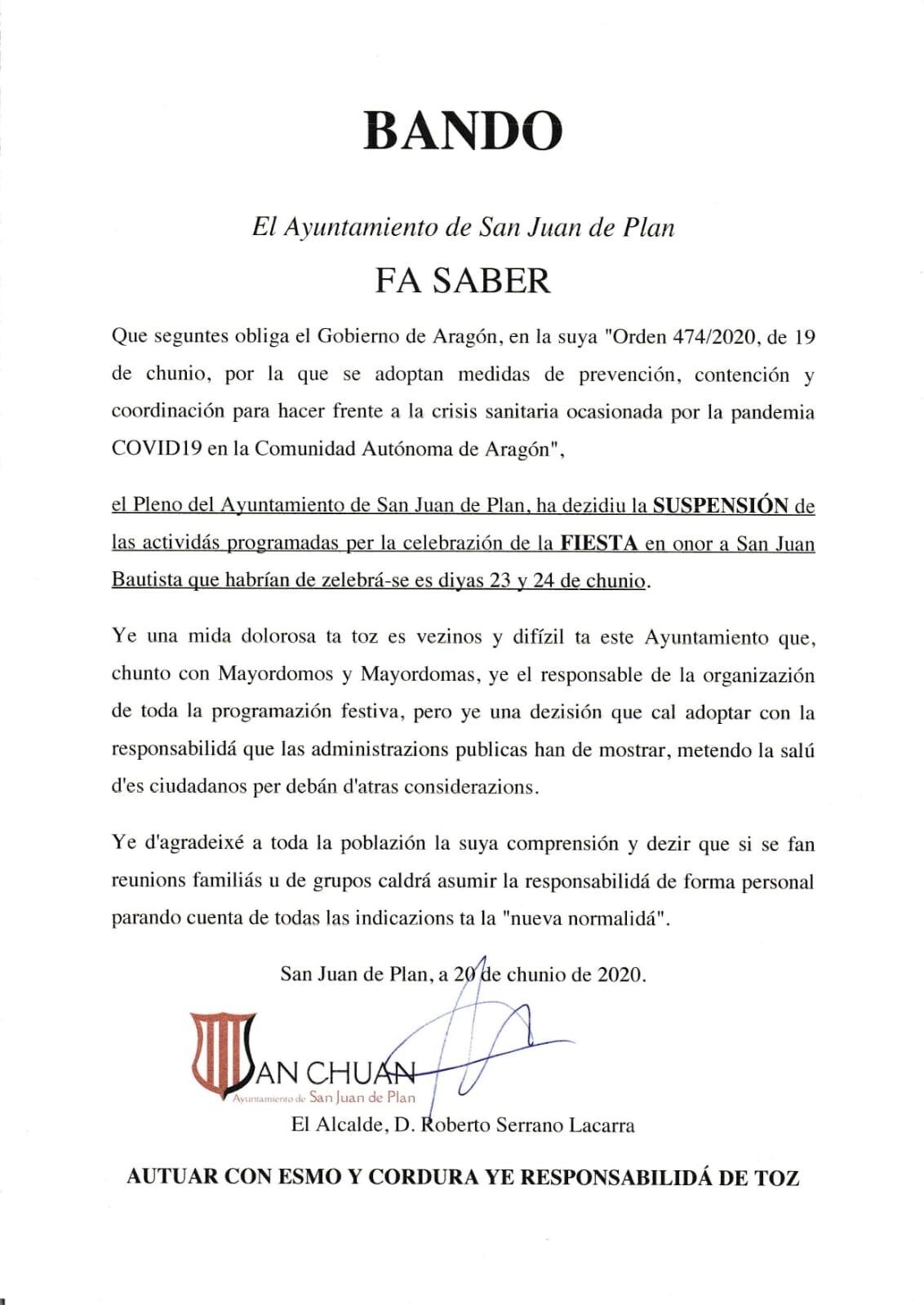 El Ayuntamiento de San Juan de Plan anunciaba la suspensión de todas las actividades previstas para la celebración de la festividad de San Juan Bautista a través de un bando escrito íntegramente en fabla aragonesa. En su texto el alcalde del municipio, Roberto Serrano, asegura que ha sido un decisión difícil y dolorosa adoptada junto a la organización de dichas fiestas y con la participación de mayordomos y mayordomas.