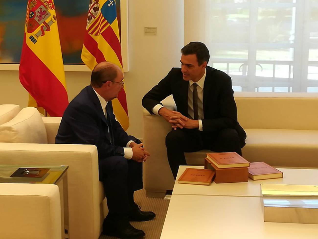 Ambiente cordial en La Moncloa, al inicio del encuentro Javier Lambán ha entregado al presidente de España´, Pedro Sánchez, el Diccionario de Madoz de las tres provincias. El "Diccionario geográfico-estadístico-histórico de España y sus posesiones en ultramar", obra magna decimonónica del político e intelectual Pascual Madoz ha servido de antesala en este primer encuentro y fallecido tal día como hoy de 1870.