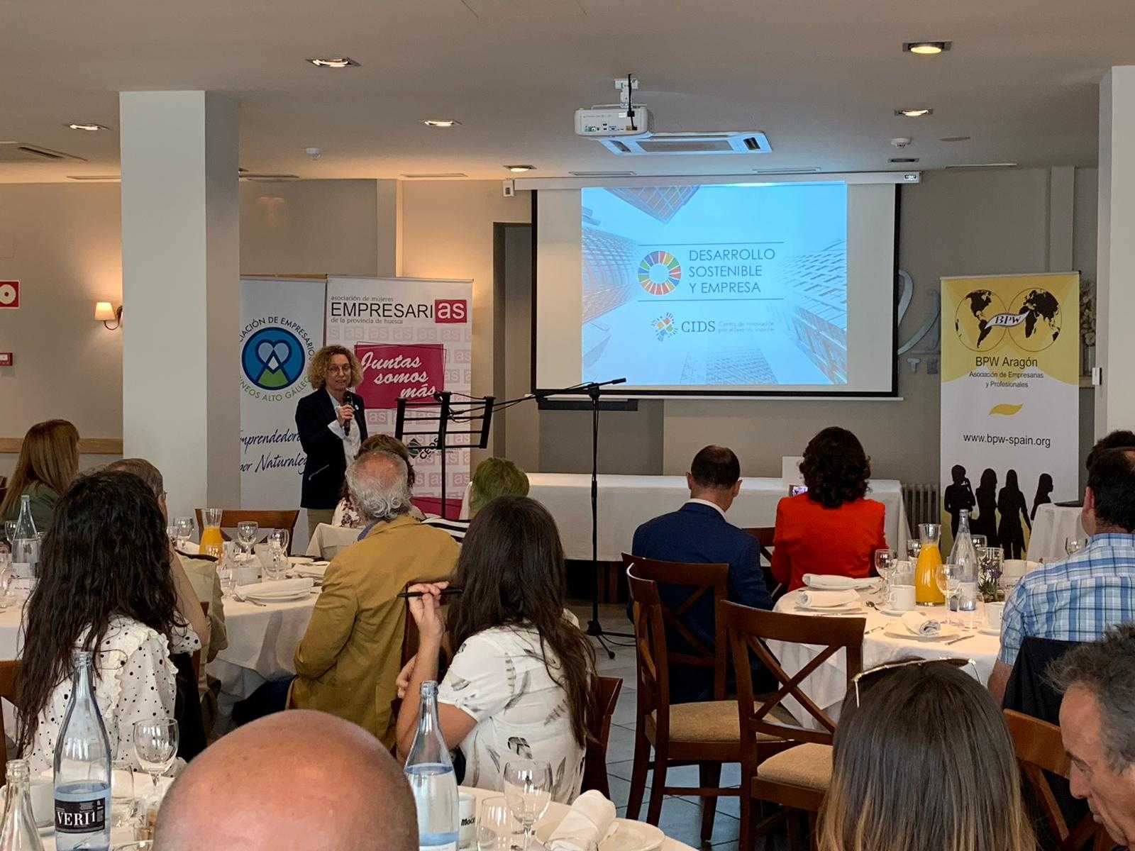 La directora general de Arpa-Equipos Móviles de Campaña e integrante de la Junta Directiva del pacto Mundial de las Naciones Unidas, Clara Arpa, ha intervenido en el “Desauno-Coloquio· sobre el “Desarrollo Sostenible y Empresa” que se ha llevado a cabo en la mañana de este lunes día 10 en Sabiñánigo.