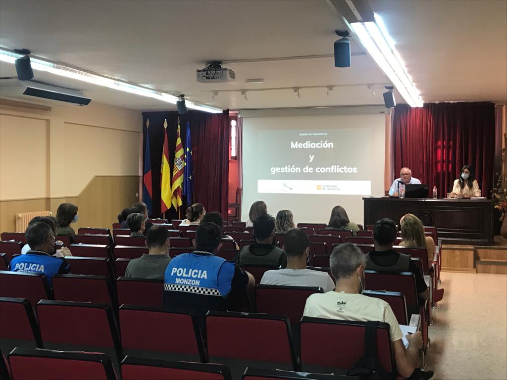 El Salón de Actos de la Casa de Cultura de Monzón acogía una sesión informativa en mediación y gestión de conflictos, organizada por los Servicios Sociales de Comarca de Cinca Medio e impartida por Joaquín Esbert García, vocal de justicia y ejercicio libre del Colegio Profesional de Trabajadores Sociales de Aragón.