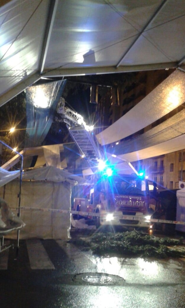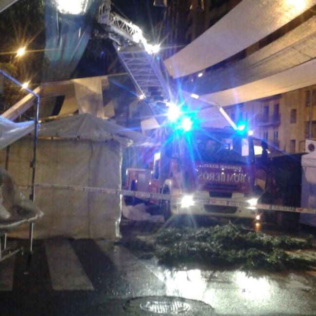 La incidencia más significativa anoche se produjo en el paseo Ramón y Cajal, donde debido al peso del agua y a fuertes rachas de viento, se venció una rama de un cedro sobre un semáforo y la estructura del entoldado que cubre los puestos de venta ambulante, sin causar daños personales ni materiales en los tenderetes. La familia propietaria del puesto más afectado por la lluvia fue reubicada en un hostal para pasar la noche.
