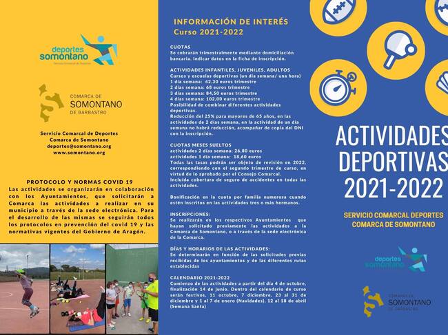 La Comarca de Somontano prepara un nuevo curso deportivo para la temporada 2021-2022, que comenzará a partir del 4 de octubre, en los diferentes municipios y desarrollarán durante tres trimestres, finalizando el 11 de junio 2022. Los ayuntamientos ya pueden solicitar las actividades deportivas presenciales para el siguiente curso a través de la sede electrónica de la Comarca.