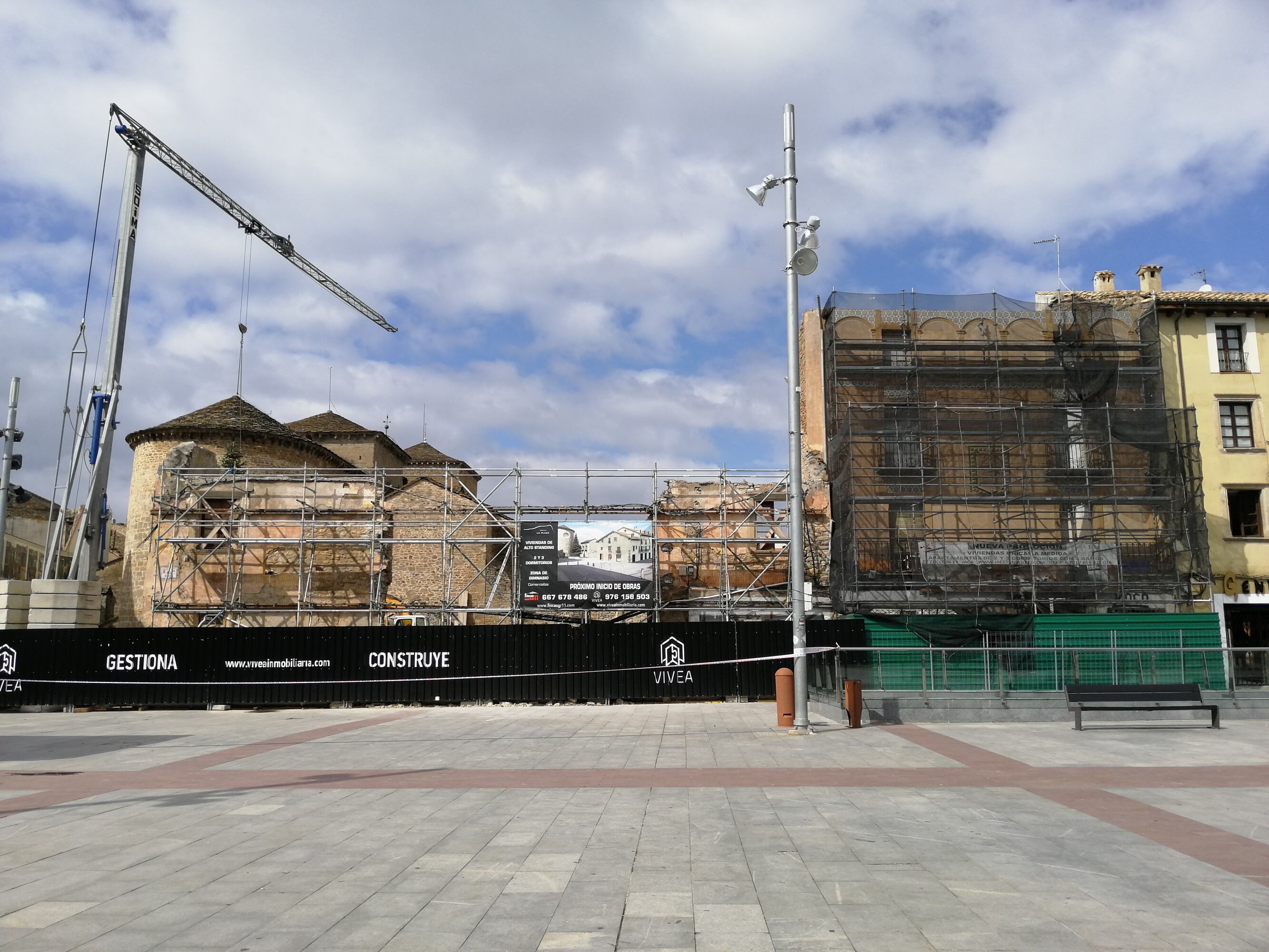Trabajos para asegurar la fachada que todavía sigue en pie de la Casa Burro de Jaca