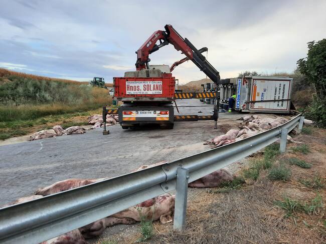 El alcalde de Peralta de Alcofea, Sergio Gambau, ha confirmado que el conductor ha resultado ileso y ha explicado que es un tramo de carretera en el que este año se han producido dos accidentes de camiones cargados con cerdos.