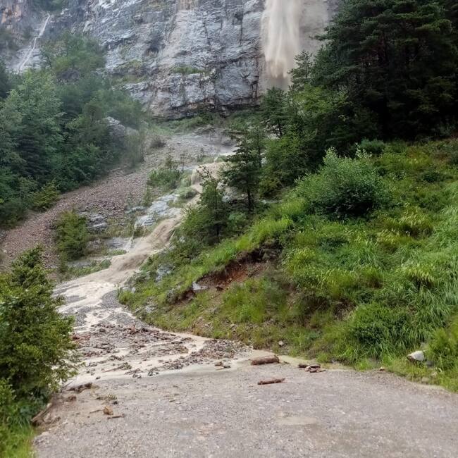 La tormenta de lluvia y granizo que dejaba este domingo más de 60 litros por metro cuadrado en Torla era la causa del derrumbe