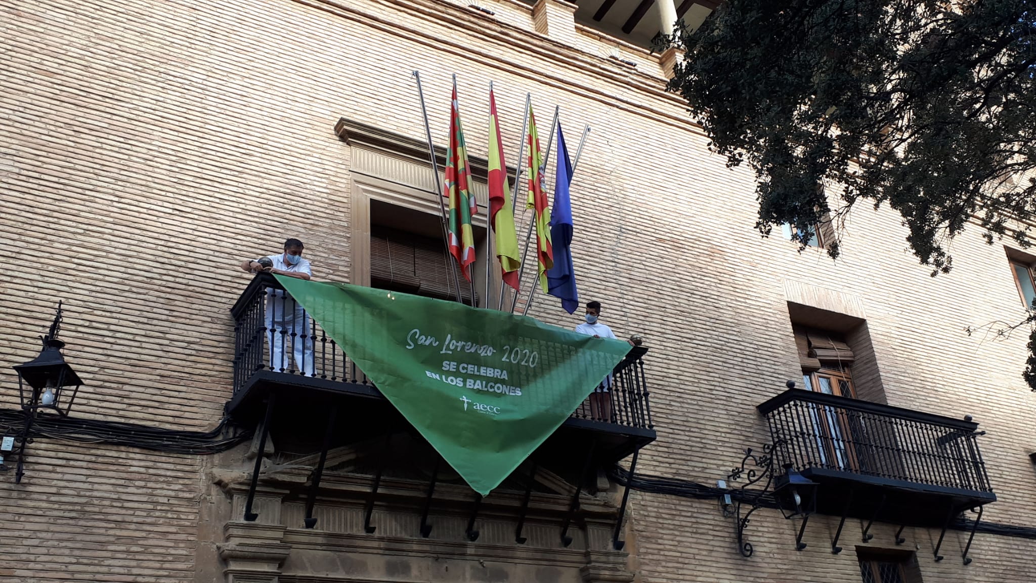 Al igual que ocurriera en Pamplona para los sanfermines, el ayuntamiento ha copiado la iniciativa y ha colgado del balcón principal la pañoleta que vendía la Asociación Española Contra El Cáncer y en la que se anima a vivir las fiestas con responsabilidad.