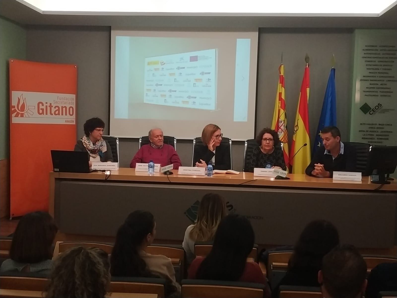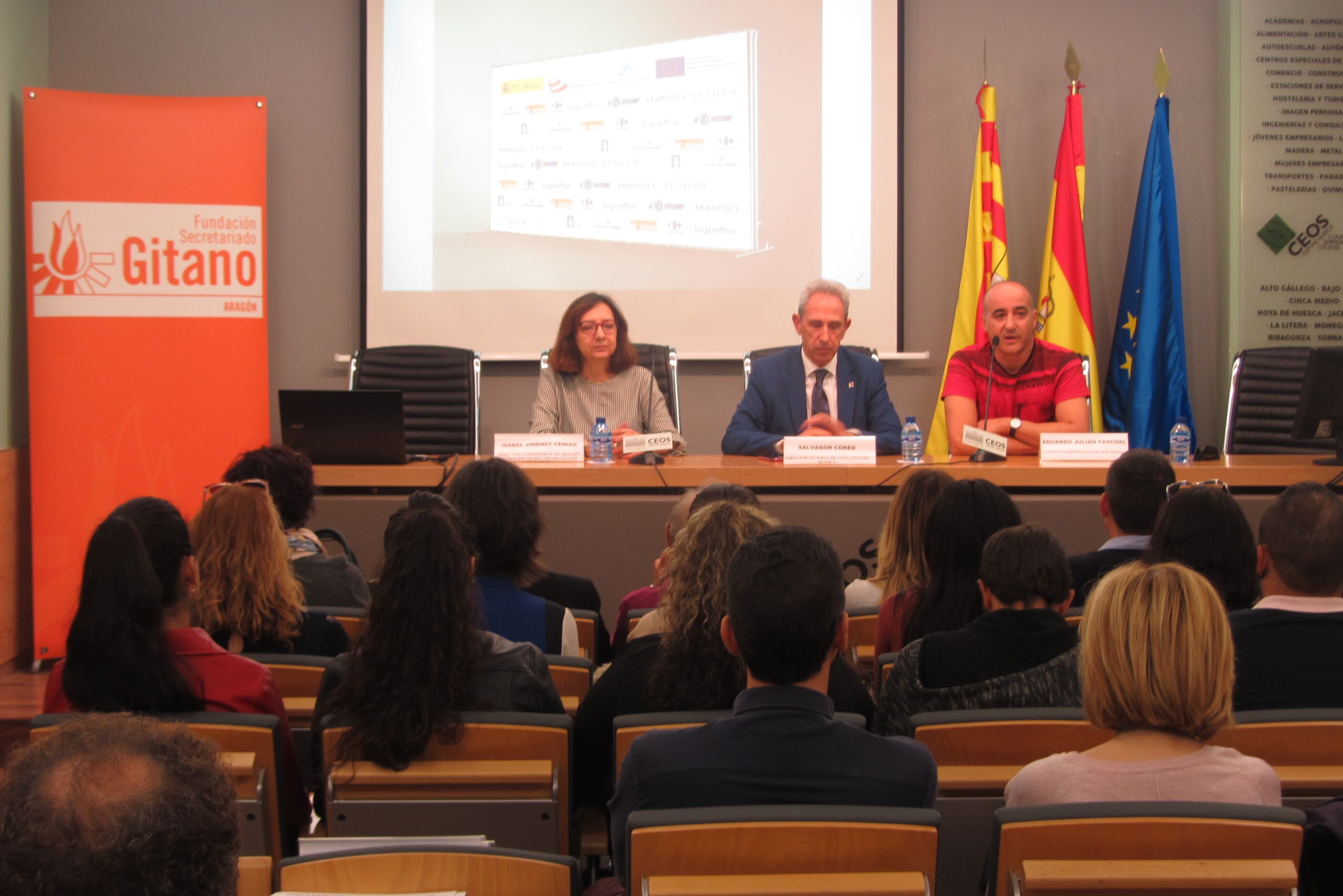 En la inauguración de la jornada participaban Isabel Jiménez, directora territorial de Aragón de Fundación Secretariado Gitano, Salvador Cored, director general de CEOS-CEPYME Huesca, y Eduardo Julián, coordinador provincial de la Fundación Secretariado Gitano en Huesca.