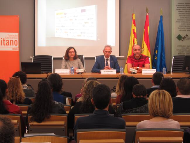 En la inauguración de la jornada participaban Isabel Jiménez, directora territorial de Aragón de Fundación Secretariado Gitano, Salvador Cored, director general de CEOS-CEPYME Huesca, y Eduardo Julián, coordinador provincial de la Fundación Secretariado Gitano en Huesca.