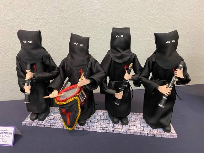 No faltan todos los cofrades de Huesca hechos con goma eva, el momento final de la procesión "El encuentro" antes de la recogida de los pasos, o la Cruz de las Siete Palabras, entre otras muchas figuras representeativas. Este año se incorporan novedades, "como los niños hebreos, una sibila, los ministriles, la Verónica…", enumeraba Jalle. Están hechas de diferentes materiales, como goma eva, telas, terciopelos e incluso materiales reciclados como cartones de Tetra Brik o latas de coca-cola.