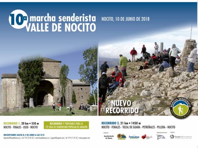 La Marcha Senderista Valle de Nocito celebra su décimo aniversario, con dos recorridos diferentes uno por la cara norte de Guara (Refugio de Fenales, Used, Bentué, San Úrbez) de 20km y 550m de desnivel y otro que asciende por el Refugio de Fenales a la cima del Tozal de Guara (2.070m) completando un recorrido de 21km y 1450m+.