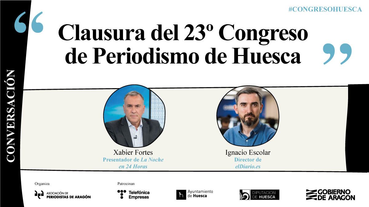 El Congreso de Periodismo de Huesca cerrará su 23ª edición con la conversación entre los periodistas Xabier Fortes, que actualmente conduce el informativo nocturno ‘La noche en 24 horas’ de TVE, e Ignacio Escolar, director de elDiario.es. La cita periodística recupera su formato habitual y se celebra el 24 y 25 de marzo en el Palacio de Congresos de la capital oscense.