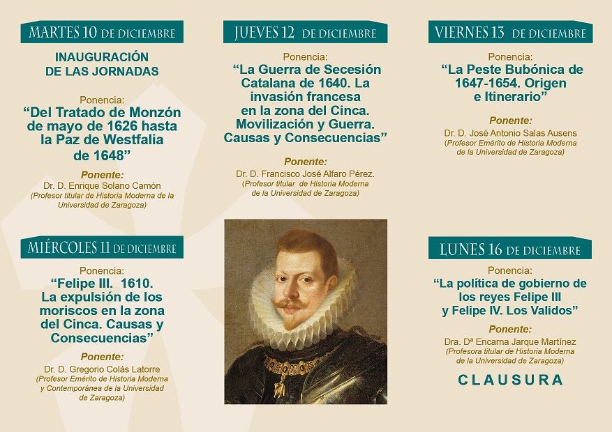 El Centro de Estudios de Monzón (CEHIMO) organiza las XIV Jornadas del Reino de Aragón, centradas en Felipe III y Felipe IV(II y III de Aragón), del 10 al 16 de diciembre en el Salón de Actos de la Casa de la Cultura.