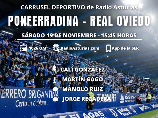En Ponferrada habrá cerca de 1.000 aficionados carbayones y junto a ellos el equipo del Carrusel Deportivo de Radio Asturias. Con Cali González como director de orquesta, Martín Gago en la narración y Manolo Ruiz junto a Jorge Regadera en los comentarios, el Principado podrá escuchar un nuevo choque de los azules en el 1.026 de la Onda Media, la aplicación de la Cadena SER o la web de Radio Asturias desde las 15:45 horas.