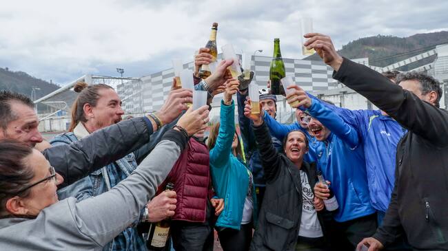Miembros del Club Atletismo Mieres celebran el premio repartido en participaciones que fueron distribuidas principalmente en los municipios de Mieres, Aller y Lena. EFE/ J. L. Cereijido / J.L.Cereijido (EFE)
