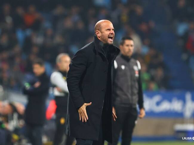 Miguel Ángel Ramírez protesta en la zona técnica de La Romareda. / LaLiga