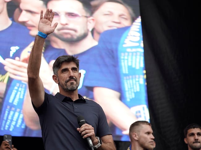 OVIEDO (ASTURIAS), 22/06/2025.- El entrenador del Real Oviedo Veljko Paunovic celebrando con la afición el ascenso a Primera División, este domingo en la capital asturiana. EFE/Paco Paredes / Paco Paredes (EFE)
